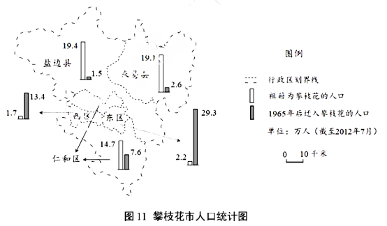 (3)据图11中信息,概括攀枝花市人口分布的两个特点。(6分)