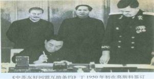 1949年10月2日,苏联第一个宣布承认中华人民共和国,并与我国正式建立外交关系。1949年底,毛泽东率领中国代表团访问苏联,举行中苏会谈。第二年初。双方签订《中苏友好同盟互助条约》。条约规定,缔约一方如果受到第三国的侵略,另一方即尽全力给予军事及其他援助。苏联政府还贷款给中国三亿美元。这对促进中国经济的恢复和发展,打破帝国主义孤立封锁中国的政策,具有重要意义。