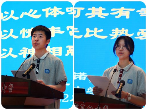 来自高一(13)班的胡文强同学和来自高一(1)班的许漪诺同学分别分享了自己在县中近一年的学习与生活体会。胡文强同学发言的题目是《以心体味、以情丰富、以神相融》,他从在校学习生活安排有序、师资力量强大、课余生活丰富等三个方面分享;许漪诺同学的发言题目是《何其有幸,无比热爱》,她回忆了自己初三备考特长生考试的难忘经历,用诗情画意的文字描述了高中校园里的美好景致和精彩课程,用无比感恩的笔触将各科老师对自己的启发和帮助娓娓道来。